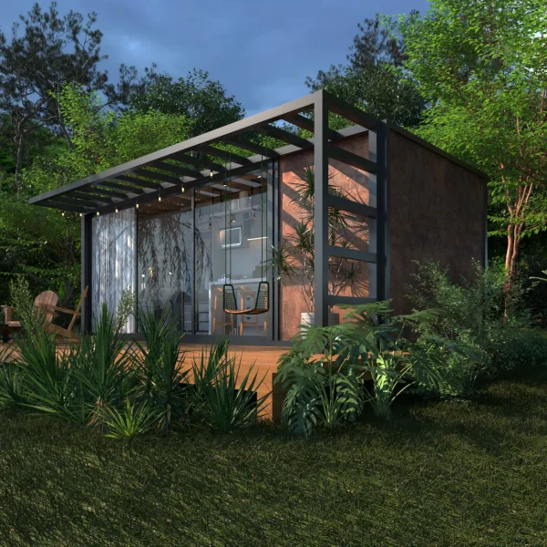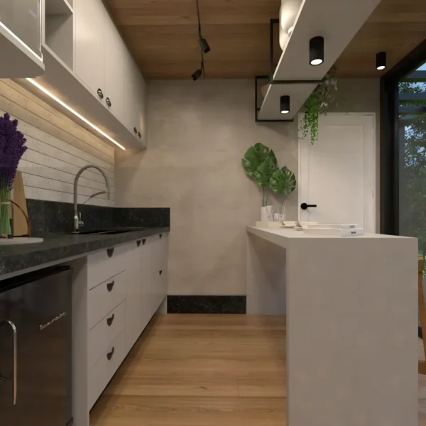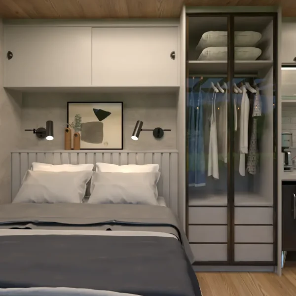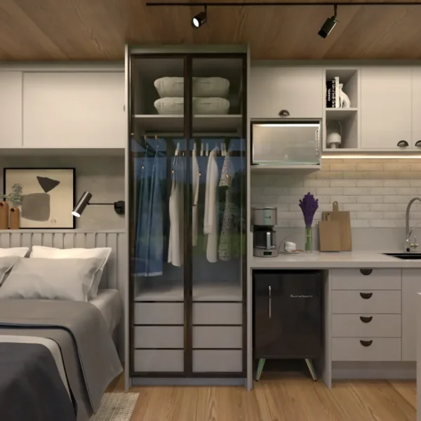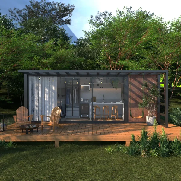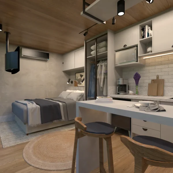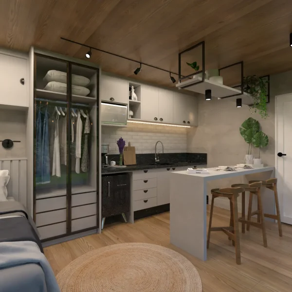 A Cabana Siena possui um design prático de 21m², onde quarto e cozinha se fundem de forma harmônica, contando com móveis feitos sob medida.
